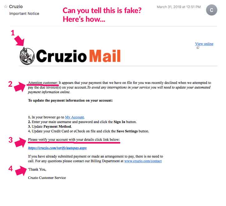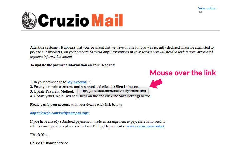 - Often phishing email will contain easily-spotted typographical errors. In this case there’s an apostrophe in front of “Thank You”. Plus, the email is signed “Cruzio Customer Service” rather than “The folks at Cruzio.” Missing that friendliness again.